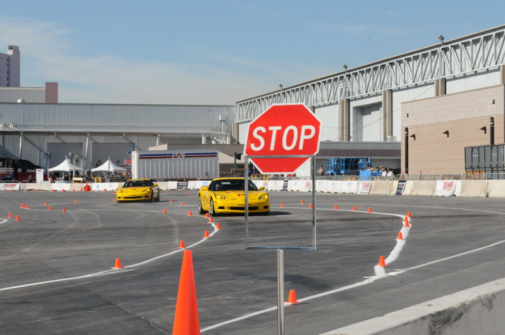 Description: Bob Bondurant instructors take SEMA participants around SEMA MotorTrend Proving Ground in C6 Corvettes Photos from SEMA Convention 2009