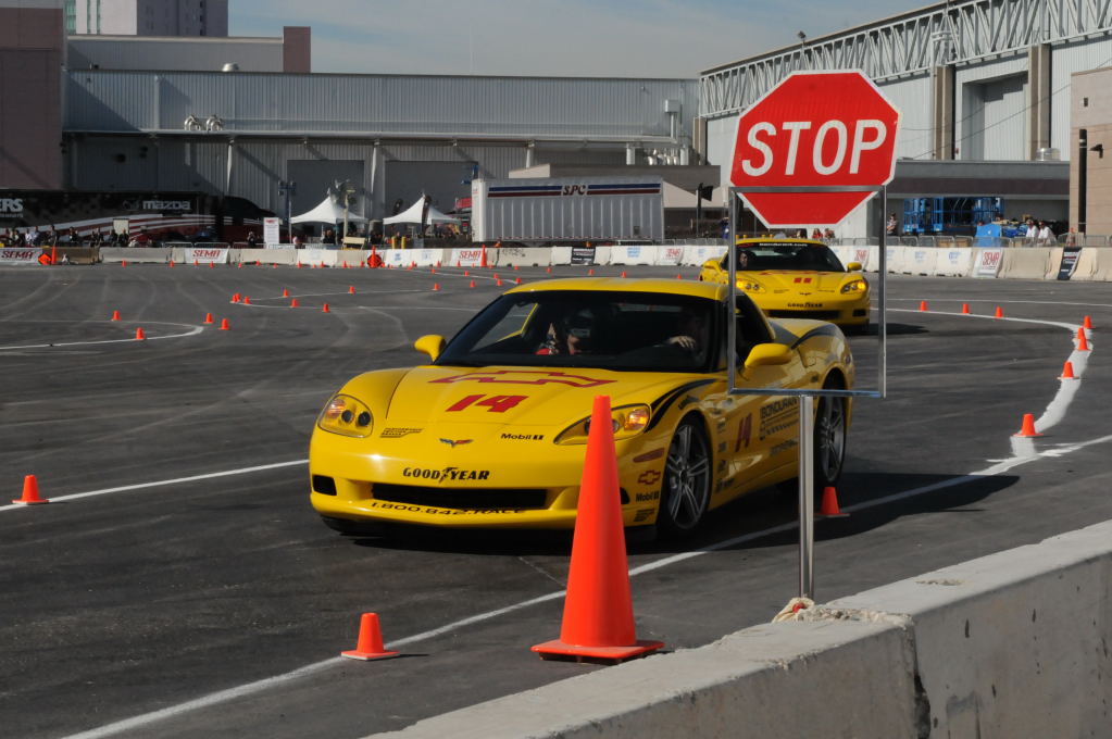 Description: Bob Bondurant instructors take SEMA participants around SEMA MotorTrend Proving Ground in C6 Corvettes Photos from SEMA Convention 2009